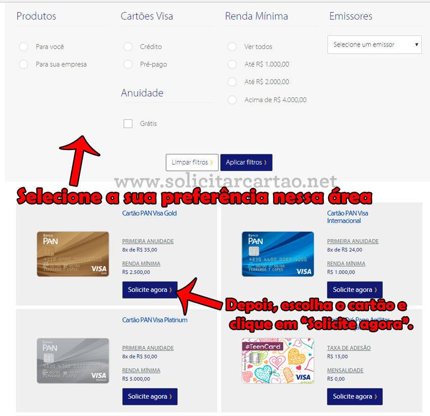 Os cartões de crédito disponíveis para solicitação no site são: